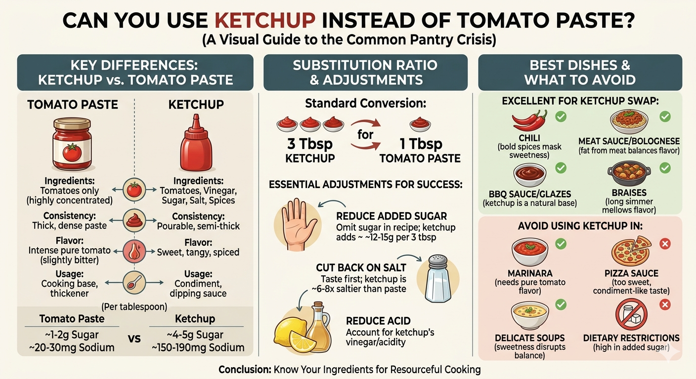 Ita — uti potes ketchup loco lycopersicii in ternum, sed mutabit saporem, dulcedinem, et constantiam catini tui. Discrimina clavium intelligenda adiuvat ut recipe te componas et optimum eventum obtineas.